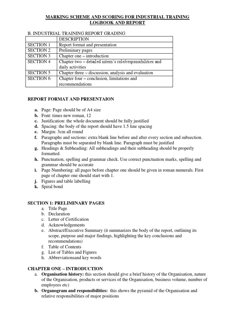 Summary Of Industrial Training Report : An actual sketch of the format and contents of the reports as well as a specification of the media used, their frequency, size and numbers of copies required are.
