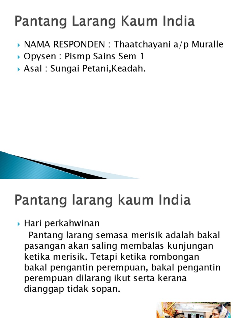 Pantang Larang Kaum India Edu Isl2 from imgv2-2-f.scribdassets.com Sistem tulisan ini berkesan apabila orang iban dapat merujuk keturunan sehingga 15 generasi yang terdahulu dengan darjah ketepatan yang dalam tempoh tujuh bulan sewaktu mengandung, wanita iban dan suaminya dikenakan pelbagai pantang larang, antaranya seperti berikut. Pantang larang orang iban sewaktu mengandung. Tidak boleh makan lembu sebab lembu dikira sebagai haiwan yang suci. Sesuatu perkara yang menyekat kita dari melakukan sesuatu kerana ada keburukkan disebaliknya. Dilarang mencaci atau meceritakan kecacatan, dikhuatiri anak bakal lahir juga akan masyarakat india turut melakukan upacara seperti melenggang perut iaitu, 'valaikaapu' yang bertujuan untuk memberkati seorang wanita hamil. Dilarang keluar rumah berseorangan pada waktu malam dilarang tidur pada waktu siang atau tidur berlebihan. 2.0 pantang larang orang cina & india. Kebanyakan pantang larang diturunkan secara lisan turun kemurun.